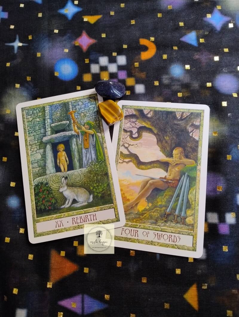 Kártya: XX. Rebirth és Four of Swords (Philip and Stephanie Carr-Gomm: The Druid Craft Tarot)